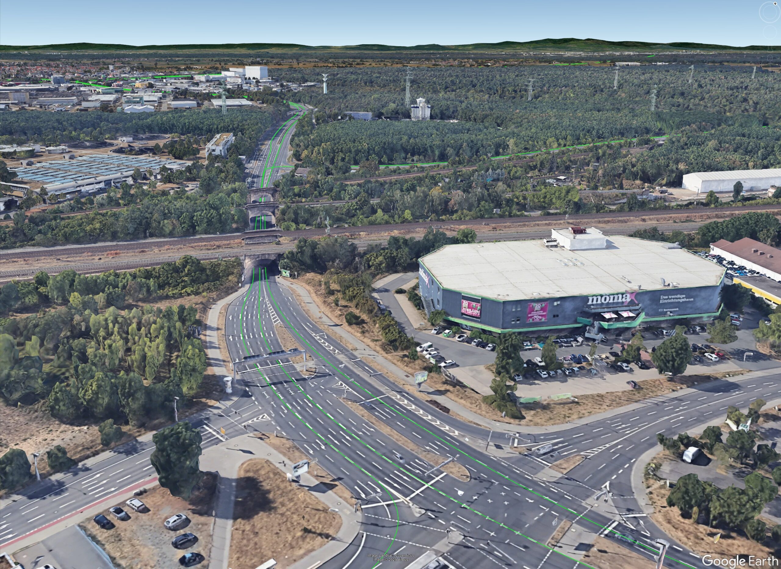Underpasses cause full satellite loss for a second or two—enough to break many RTK solutions. With tightly-coupled Network-PPK, forward/backward ambiguity fixing, and dynamic pivot switching, AlgoNav holds or rapidly re-locks fix through bridges and even under canopies. Based on 20 one-hour drives in Darmstadt/Frankfurt (Triumph-LS + MTi G-700).