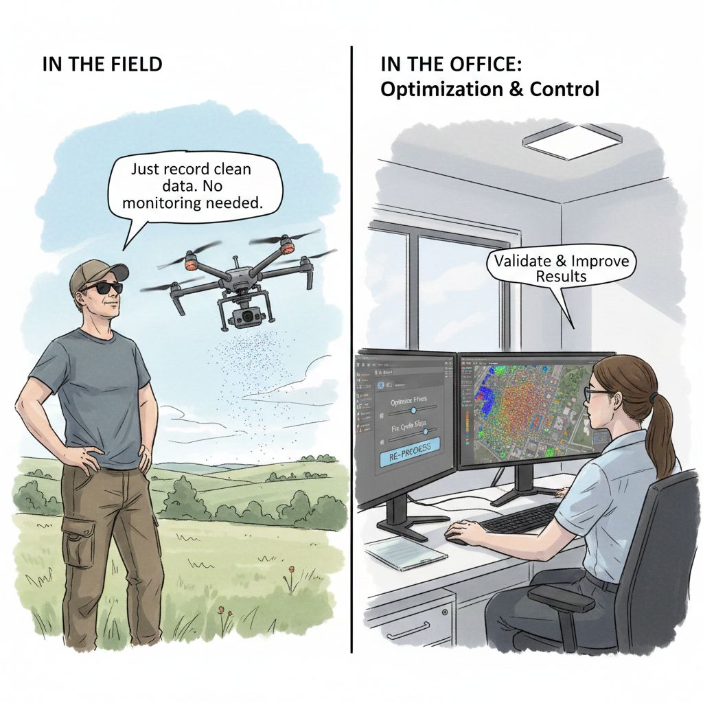 Operationally, post-processing is often a relief, because the field setup becomes less “fragile”. You don’t need the sensors to tightly communicate with each other to produce a fused solution live – they just need stable time stamping and reliable recording. If one component has a hiccup, you still have the data.